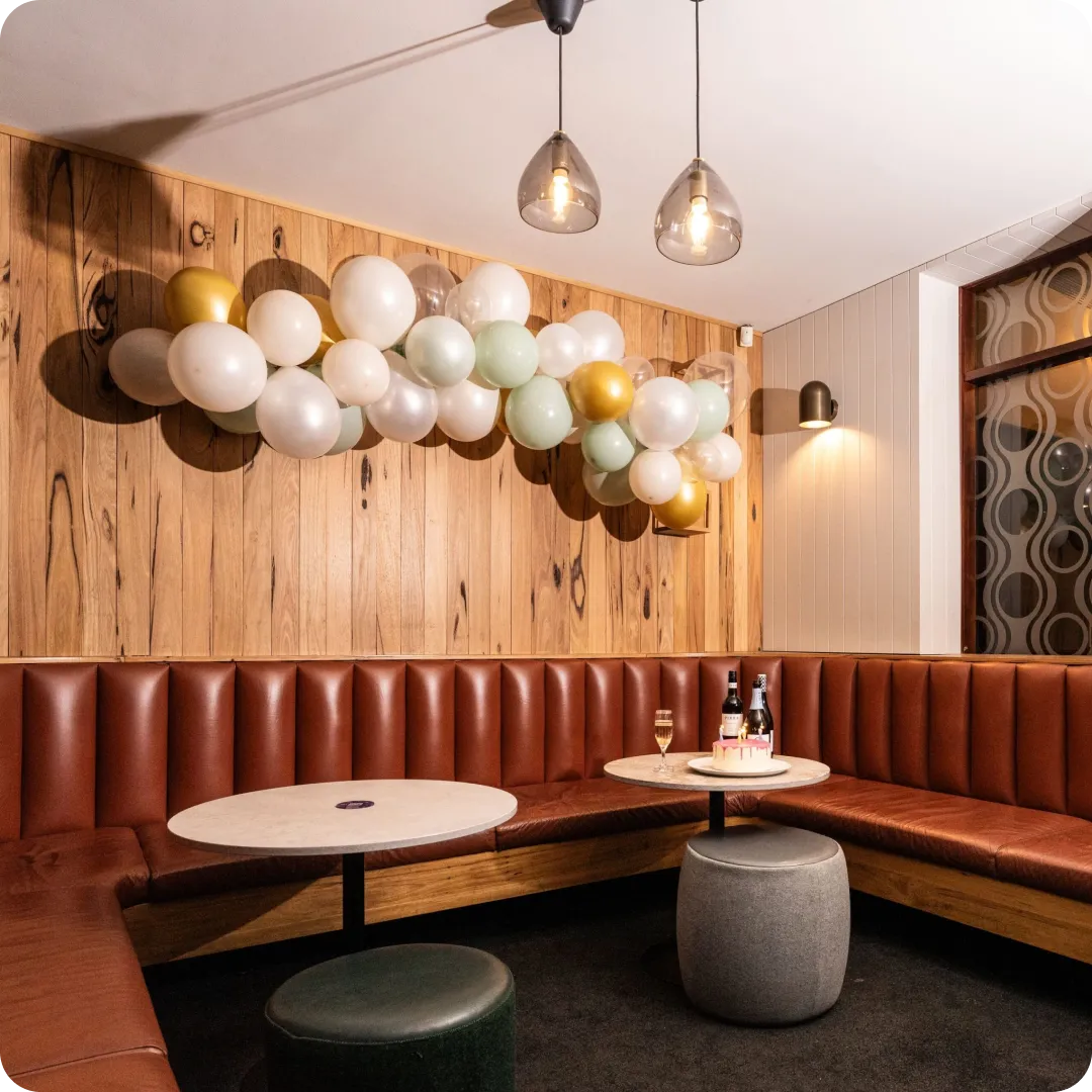 The Alcove gives you a tucked-away space with the vibe of the main bar close by. It suits small celebrations and casual gatherings, and there is no room hire fee. A 75-inch screen is available for photo slideshows.