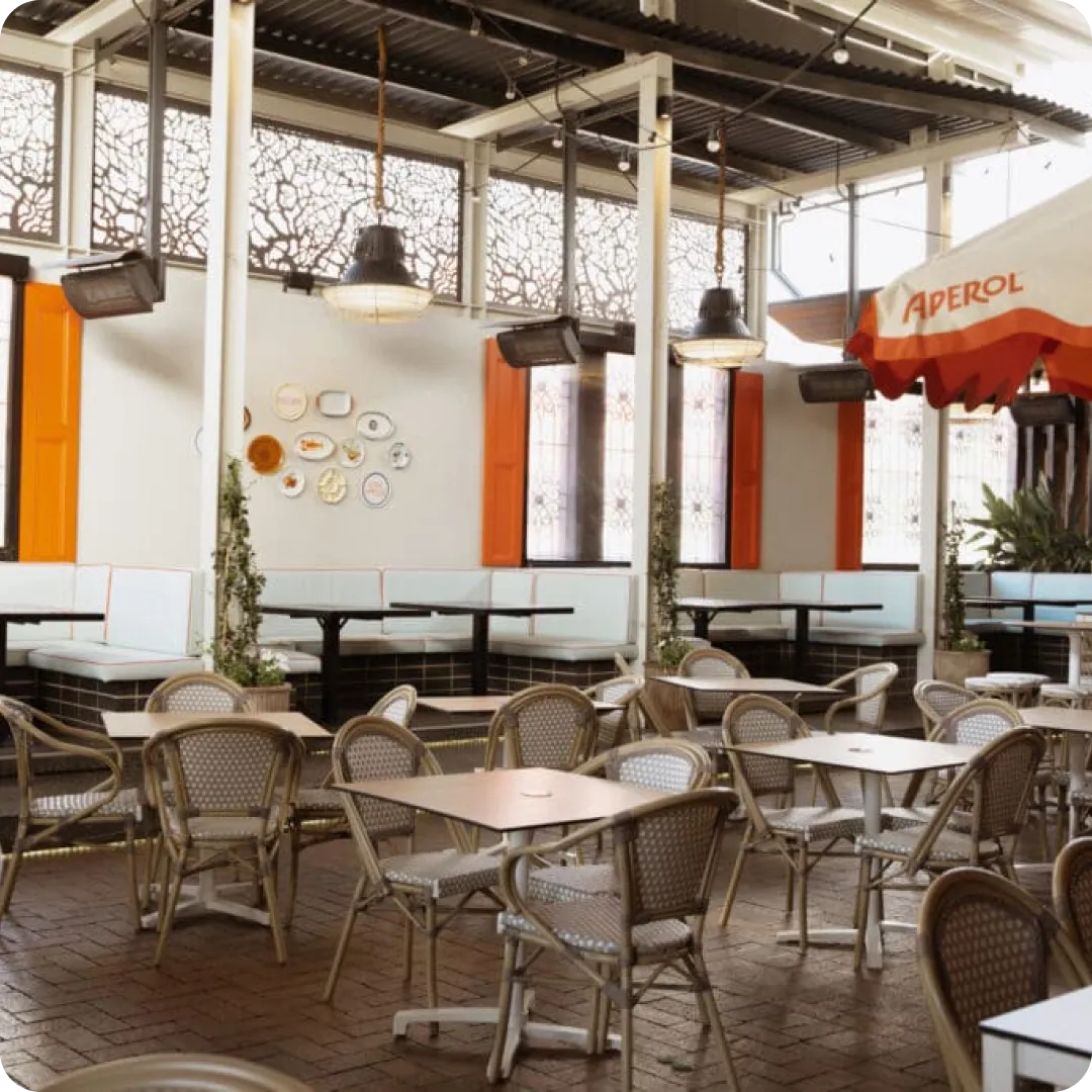 The Garden Bar gives you a customisable, open-air area with booths, heaters, misting, and a retractable roof. You can book the whole space or section off an area for a smaller group.